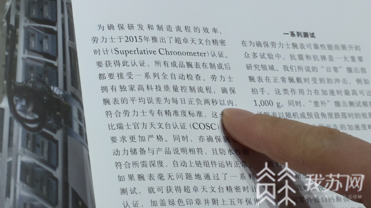 记者在南京中央商场劳力士专柜也看到了同样的宣传:“劳力士于2015年推出了超卓天文台精密时计认证。拥有独家高科技质量控制流程,确保腕表的平均误差为每日正负2秒以内,符合劳力士专有精准度标准,这一标准比瑞士官方天文台认证设定的要求更加严格。”