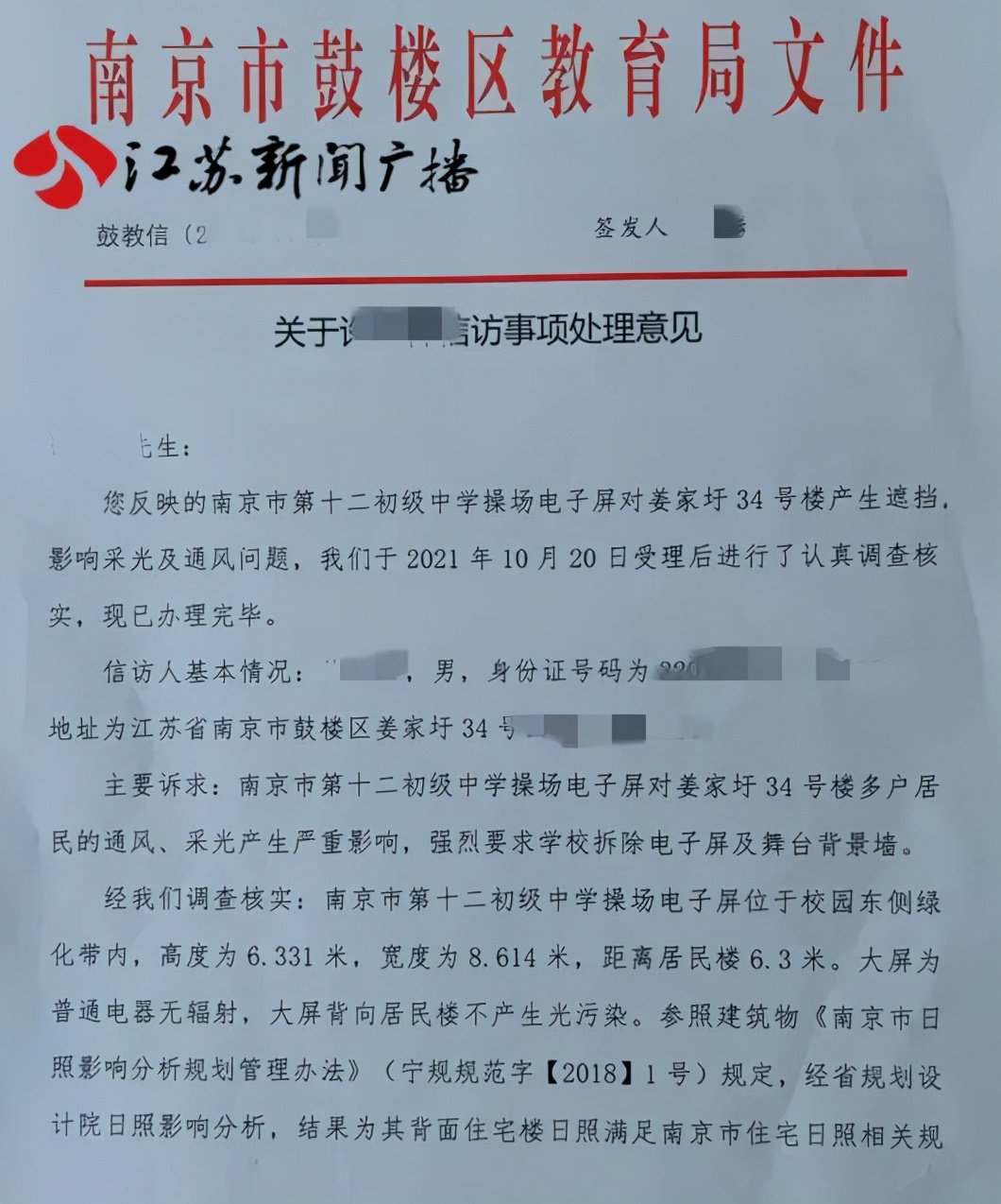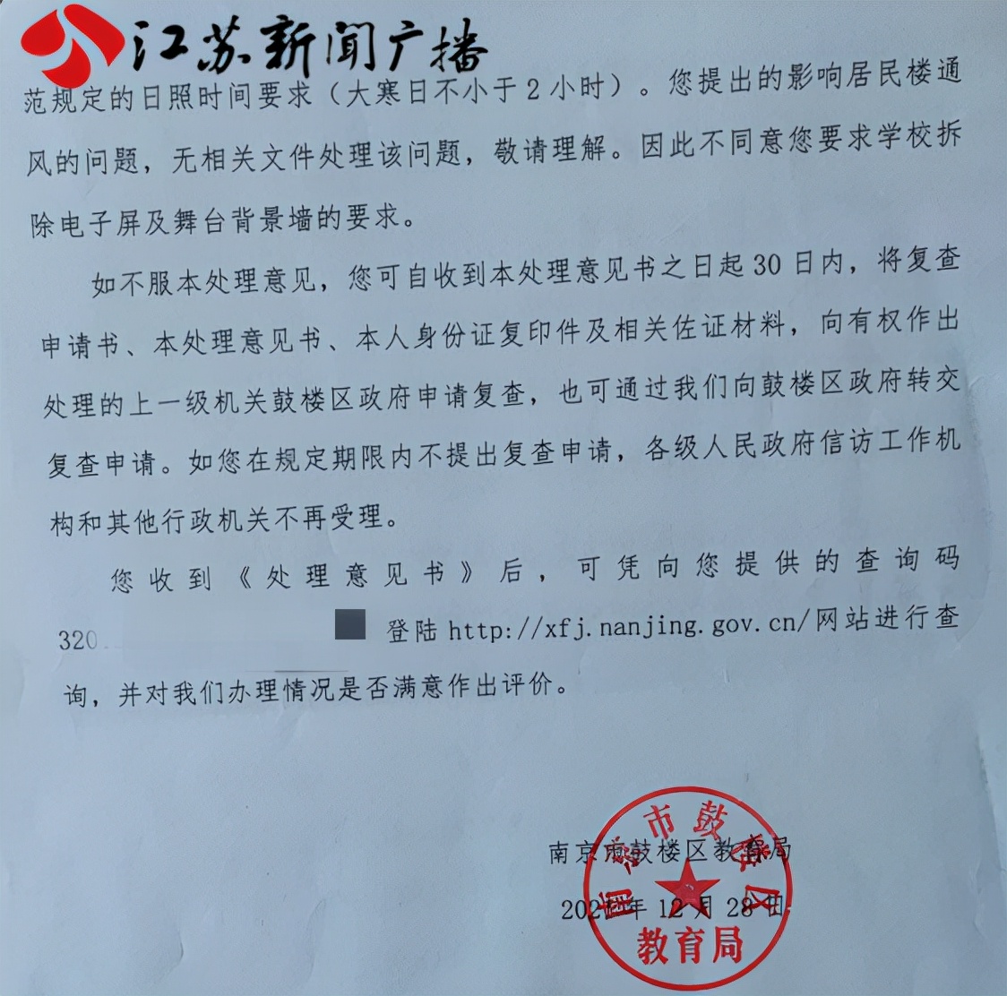 2021年12月28日,鼓楼区教育局曾对此事进行书面回复,称参照建筑物《南京市日照影响分析规划管理办法》规定,经省规划设计院日照影响分析,结果为电子大屏背面住宅楼日照满足南京市住宅日照相关规范规定的日照时间要求(大寒日不小于2小时),因此不同意许先生要求学校拆除电子屏及舞台背景墙的要求。