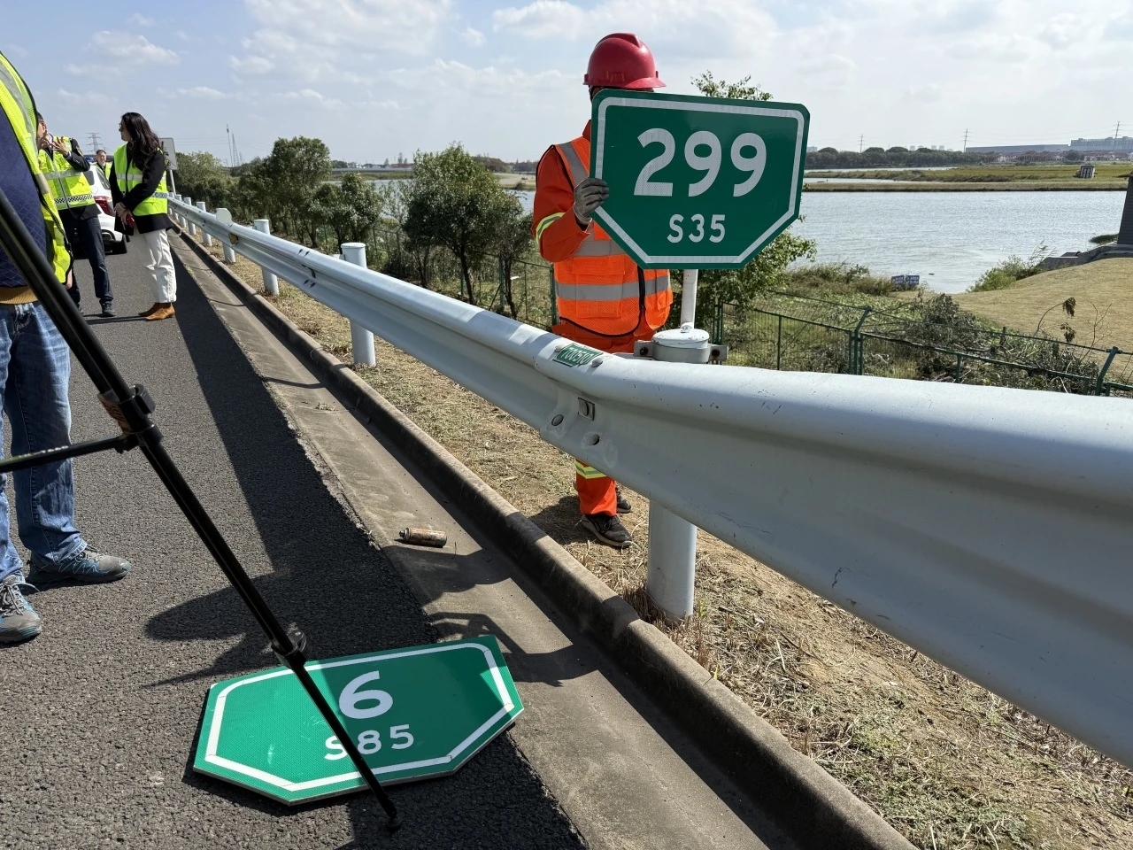 10月22日,记者跟随督办人员来到S35阜溧高速溧阳往阜宁方向,299公里处。施工人员正在陆续更换新的里程牌。将原来的里程牌S85拆下,换上了新的里程牌S35。
