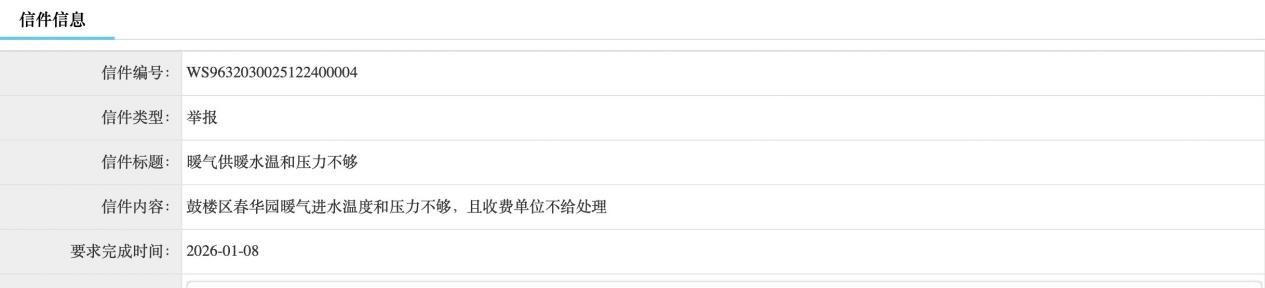12月29日,鼓楼区房产服务中心回复,由于小区使用暖气片的业主较多,如果进水温度低将无法保证小区业主的用暖效果。针对业主反映的问题,房产服务中心已经要求润源热力公司,根据春华园小区的实际情况,适当提高小区机房的进水温度,切实保证业主的用暖效果。润源公司生产部负责人表态会及时调整压力和进水温度,保证业主用暖效果。