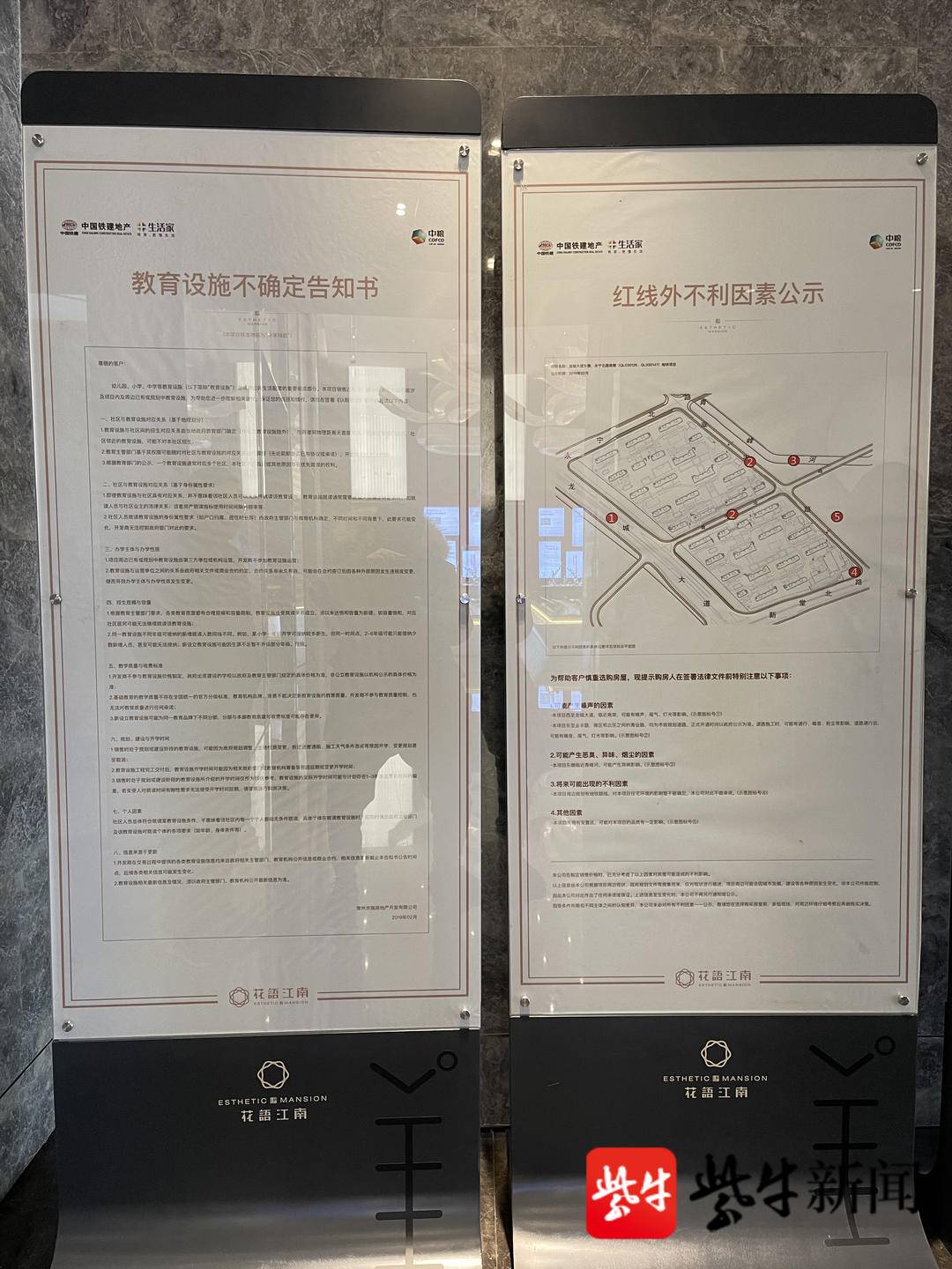 有业主反馈开发商在卖房时曾承诺过花语江南是“二实小”学区房,对此该经理表示,花语江南这个楼盘是中国铁建和中粮合资的地产项目,从公司层面来讲这肯定是不可能的,他们主要做的是品质楼盘,而不是为了卖学区来的。此外,他们在售楼处大厅也放置了“教育设施不确定告知书”以及“红线外不利因素公示“。