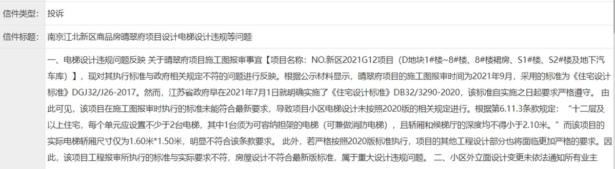 网友:南京江北新区商品房晴翠府项目电梯设计违规。根据公示材料显示,晴翠府项目的施工图报审时间为2021年9月,采用的标准为《住宅设计标准》DGJ32/J26-2017。然而,江苏省政府早在2021年7月1日就明确实施了《住宅设计标准》DB32/3290-2020,该标准自实施之日起要求严格遵守。根据条款规定:“十二层及以上住宅,每个单元应设置不少于2台电梯,其中1台须为可容纳担架的电梯(可兼作消防电梯),且轿厢和候梯厅的深度均不得小于2.10米。”而该项目的实际电梯轿厢尺寸仅为1.60米*1.50米,明显不符合该条款要求。由此可见,该项目在施工图报审时执行的标准未能符合最新要求,导致项目小区电梯设计未按照相关规定进行。