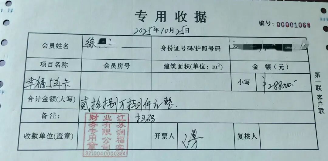 “我在他们办公室签的合同,到前台扫的收款二维码,支付宝上显示抬头为江苏润福实业有限公司,款项直接进入公司账上。这笔费用本质上属于养老预付费卡,按规定单张卡限额最多5000元,且必须进监管账户,他们的操作明显违规。”徐先生表示,自己多方投诉后,这笔款项已被退回。
